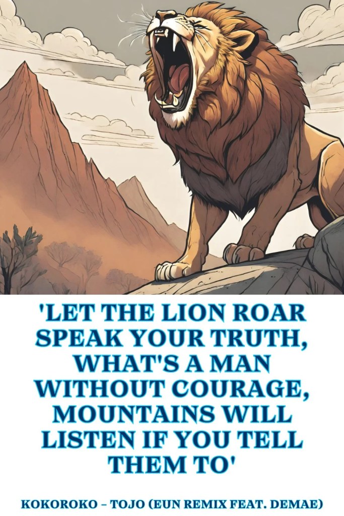 Kokoroko - Tojo (Eun Remix feat. Demae) 'Let the lion roar speak your truth, What's a man without courage, Mountains will listen if you tell them to' Could We Be More Remixes by Kokoroko Favourite Lyric Could We Be More Remixes by Kokoroko Share this:Click to share on Twitter (Opens in new window)Click to share on Facebook (Opens in new window)Click to share on WhatsApp (Opens in new window)Click to share on Pinterest (Opens in new window)Click to email a link to a friend (Opens in new window)MoreClick to share on Pocket (Opens in new window)Click to share on Tumblr (Opens in new window)Click to share on Telegram (Opens in new window)Click to share on Reddit (Opens in new window)Like this:Like Loading... Related